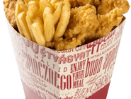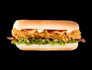 Bułka pszenna,2 stripsy,chrupiący bekon,ser cheddar,papryka,pomidor,czerwona cebula,sałata lodowa,ogórek konserwowy,ketchup,sos czosnkowy,sos BBQ, -